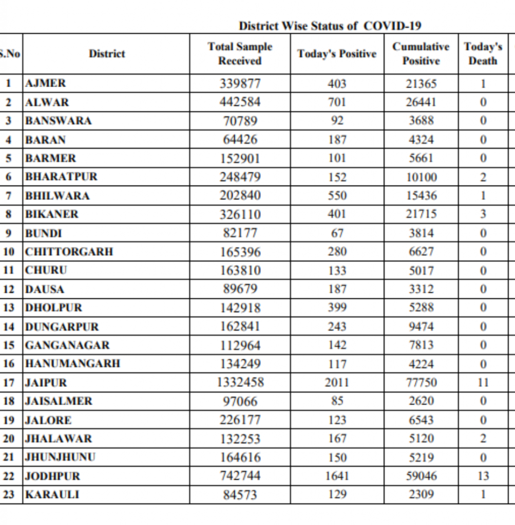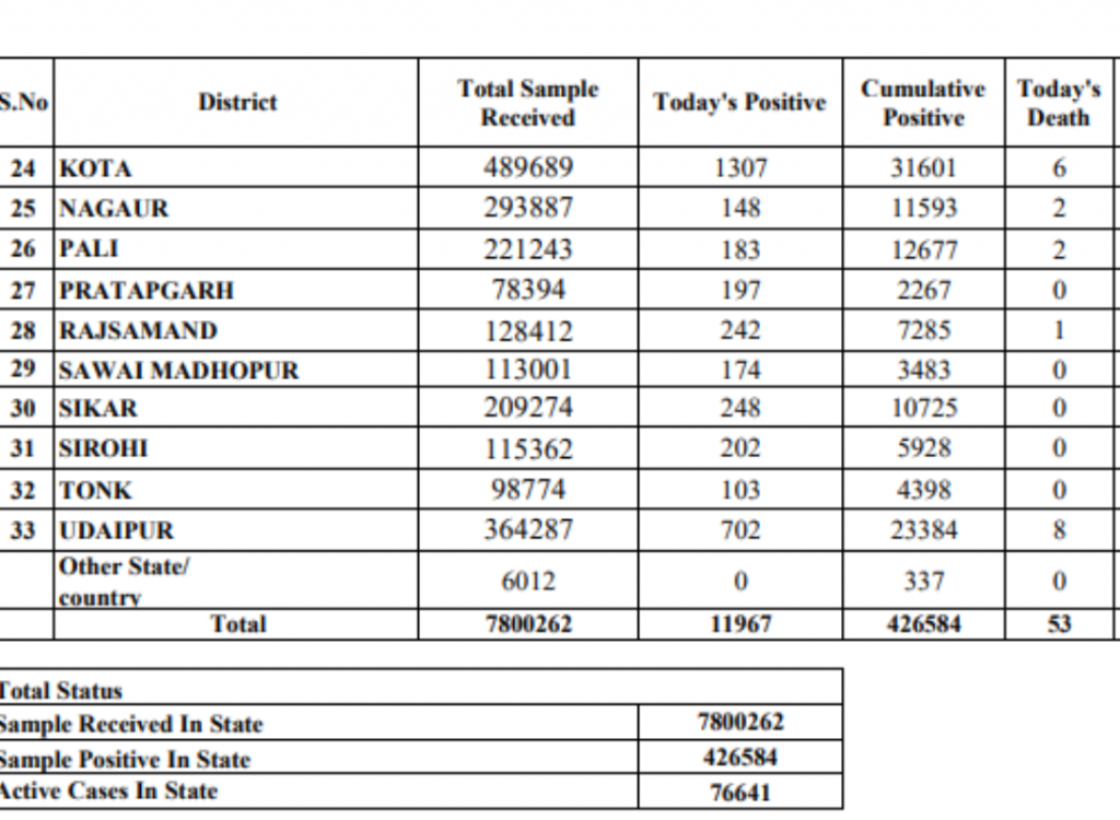 राजस्थान: आज मिले रिकॉर्ड 11 हजार 967 संक्रमित, 53 की मौत, जयपुर, जोधपुर, कोटा, उदयपुर में हालात बदतर
