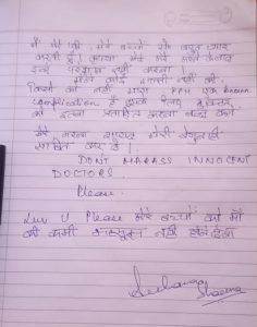 डॉ. अर्चना शर्मा ने आत्महत्या करने से पहले सुसाइड नोट लिख दिया था। इसमें उन्होंने लिखा है कि, मैं मेरे पति और बच्चों से बहुत प्यार करती हूं। कृपया मेरे मरने के बाद इन्हें परेशान मत करना। मैंने कोई गलती नहीं की, ना ही किसी को मारा है। पीपीएच एक नॉन कॉप्लीकेशन है । इसके लिए डॉक्टर को इतना प्रताड़ित करना बंद करो। मेरा मरना शायद मेरी बेगुनाही साबित कर दे। Don’t harass doctors (डॉक्टरों को प्रताड़ित मत करो)। सुसाइड नोट के अंत में लिखा है कि, मेरे बच्चों को मां की कमी महसूस नहीं होने देना। नीचे डॉक्टर के हस्ताक्षर हैं।