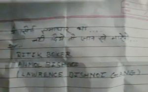 फायरिंग के दौरान बदमाशों ने होटल की तरफ धमकी भरा लेटर छोड़ा। जिसमें लिखा था- ‘ये सिर्फ समाचार था…एक करोड़ नहीं दिए तो जान से मारेंगे। रितिक बॉक्सर, अनमोल बिश्नोई (लॉरेंस बिश्नोई गैंग)। रितिक बॉक्सर, अनमोल बिश्नोई।’ इसके बाद जी क्लब पर फायरिंग करने की जिम्मेदारी लेने का फेसबुक पोस्ट भी किया गया।