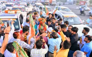 इससे पहले नीमराणा, बहरोड़, कोटपुतली विराट नगर, पावटा, शाहपुरा, चंदवाजी, आमेर और जयपुर शहर में स्थित खोल के हनुमान जी, ट्रांसपोर्ट नगर चौराहा, धर्मसिंह सर्किल, त्रिमूर्ति सर्किल, स्टेच्यू सर्किल पर स्वागत कार्यक्रम में शामिल होने के बाद जोशी बीजेपी मुख्यालय पहुंचे। जयपुर ग्रामीण सांसद राज्यवर्धन सिंह राठौर, सीपी जोशी की गाड़ी चला रहे थे। अलवर सांसद बाबा बालकनाथ ने बीजेपी के नवनियुक्त अध्यक्ष सीपी जोशी को गाड़ी पर चढ़कर दी बधाई।