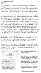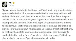 शिकायत करने वाले कई नेताओं ने सोशल मीडिया हैंडल X पर पोस्ट अलर्ट मैसेज की स्क्रीन शॉट साझा की है। इसमें लिखा है,” अगर आपके डिवाइस के साथ किसी राज्य-प्रायोजित हमलावर ने छेड़छाड़ की है तो वे आपके संवेदनशील डेटा, कम्युनिकेशन, या यहां तक कि कैमरा और माइक्रोफोन तक पहुंचने में सक्षम हो सकते हैं।”