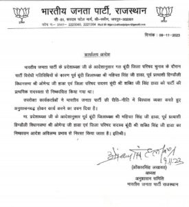भाजपा अनुशासन समिति के अध्यक्ष ओंकार सिंह लखावत ने यह आदेश जारी किया है। इसमें लिखा हुआ है कि भारतीय जनता पार्टी के प्रदेश अध्यक्ष के आदेश अनुसार गत जिला परिषद चुनाव के दौरान पार्टी विरोधी गतिविधियों के कारण भाजपा के पूर्व जिला अध्यक्ष महिपत सिंह हाड़ा, पूर्व प्रत्याशी हिंडोली विधानसभा ओमेंद्र सिंह हाड़ा व जिला परिषद सदस्य शक्ति सिंह हाड़ा को पार्टी की प्राथमिक सदस्यता से निष्कासित कर दिया गया था। तीनों कार्यकर्ताओं ने भारतीय जनता पार्टी की रीति-नीति में विश्वास व्यक्त करते हुए अनुशासन बद्ध होकर कार्य करने का वचन दिया है। प्रदेश अध्यक्ष के आदेशानुसार इनका निष्कासन आदेश अविलम्ब प्रभाव से निरस्त किया जाता है।