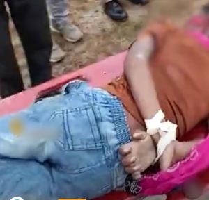 बच्चे के शरीर पर हल्के केसरिया रंग की टीशर्ट और हल्के नीले रंग की जींस पेंट है। उसके गले में भी गमछेनुमा एक कपड़ा डला हुआ था।