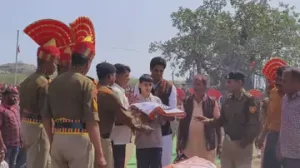 गांव के बाहर करीब एक किलोमीटर तक सड़क के दोनों ओर ग्रामीण और स्कूली बच्चे पुष्प वर्षा के लिए फूल लेकर खड़े थे।