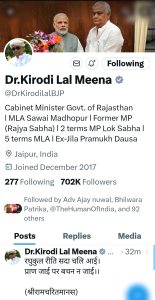 लम्बी चली अटकलबाजियों के बीच राजस्थान के कृषि मंत्री और भाजपा के वरिष्ठ नेता डॉ. किरोड़ी लाल मीणा ने आखिरकार आज गुरुवार सुबह मंत्री पद से इस्तीफा दे ही दिया। जैसे ही यह खबर बाहर आई बीजेपी के हलकों में फिलहाल तक चुप्पी छा गई। हालांकि डॉ. मीणा ने अपने एक्स हेंडल अकाउंट की प्रोफाइल से फिलहाल तक केबिनेट मंत्री पद नहीं हटाया है। इसके अलावा उन्होंने इस पर लिखा है-